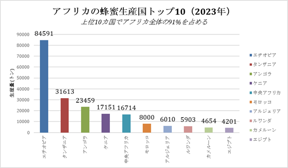 アフリカ大陸と一括りに言っても、その生産構造は国によって大きく異なる。一部の国が生産量の大半を占める集中型の構造が特徴だ。2023年のデータに基づくと、アフリカの蜂蜜生産国トップ10は以下の通りである。この10カ国だけで、アフリカ全体の蜂蜜生産量の約91%を占めている。