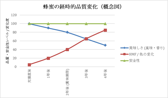 蜂蜜の品質は時間と共に変化するが、安全性は維持される。賞味期限は「美味しさ」が一定レベルを保つ期間の目安を示す。