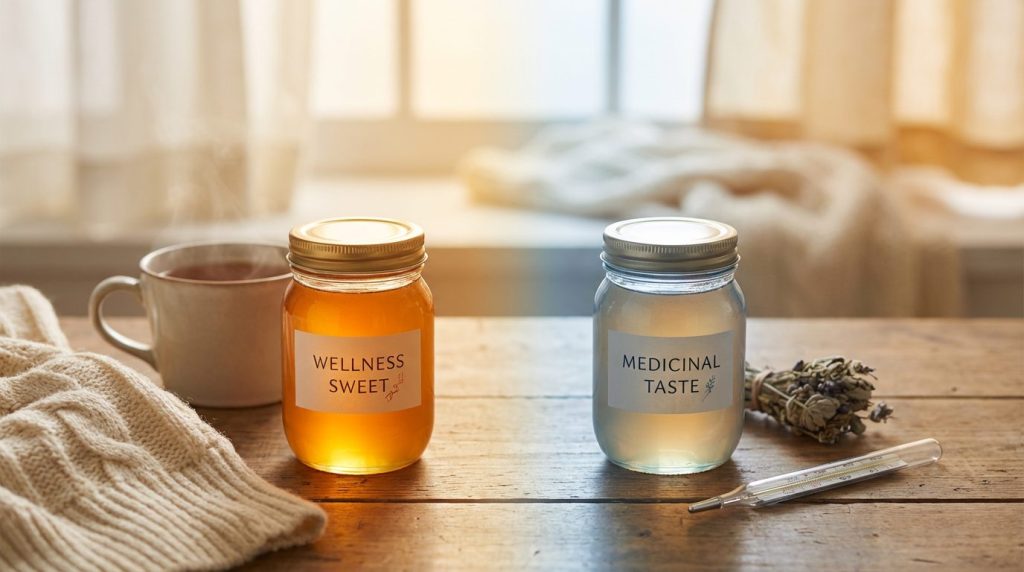 普段通りの体調の時に、風邪用のハチミツを食べると「美味しくない、まずい、にがい、薬みたいな味がする」という味の感じ方をする人が多いのですが、風邪を引いて発熱した途端、風邪用のハチミツを「おいしい!」と感じる体験をするのです。